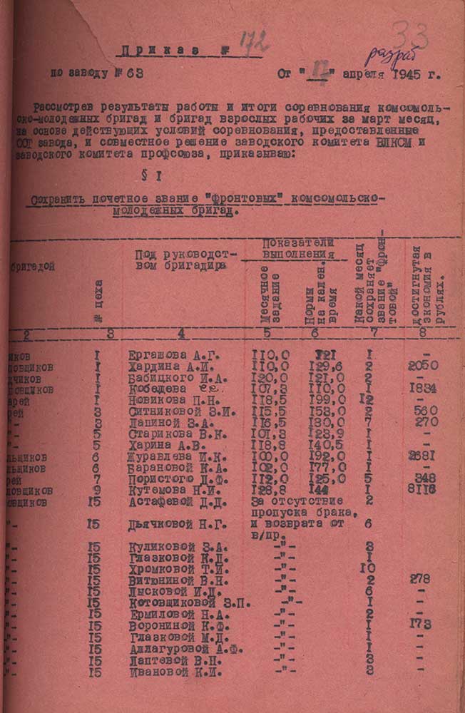 Приказ № 172 от 17 апреля 1945 г. "По заводу № 63"