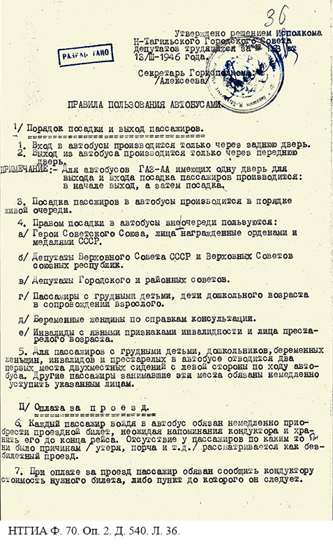 Позднее, решением исполкома Нижнетагильского городского Совета депутатов трудящихся от 13 марта 1946 г. были утверждены Правила пользования автобусами. Документом было установлено, что каждый автобусный маршрут должен обслуживаться кондукторами.
