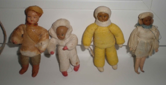 Елочных игрушек русского производства тогда еще не было, их заказывали в Европе. Дорогие стеклянные изделия могли позволить себе только богачи, а в домах среднего достатка на долгие годы поселились игрушки из прессованного хлопка и ваты, которые продолжали выпускаться до 50-х годов 20 века (фото 001).