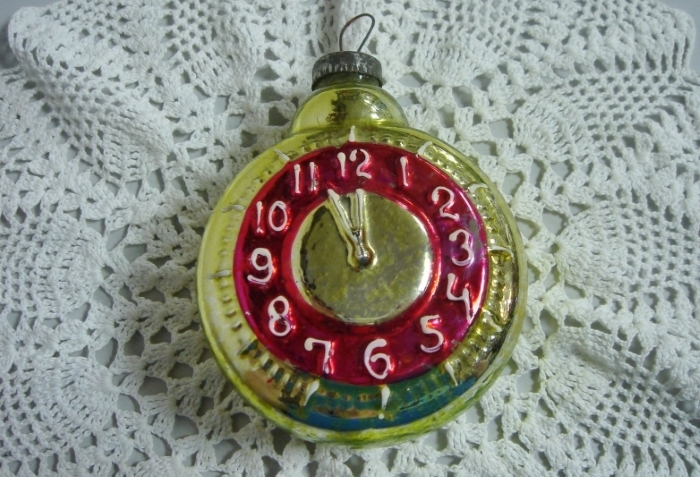 С выходом на экраны кинотеатров фильма «Карнавальная ночь» на ёлках все чаще стали появляться игрушечные часы, стрелки которых неизменно показывали без пяти двенадцать (фото 005).