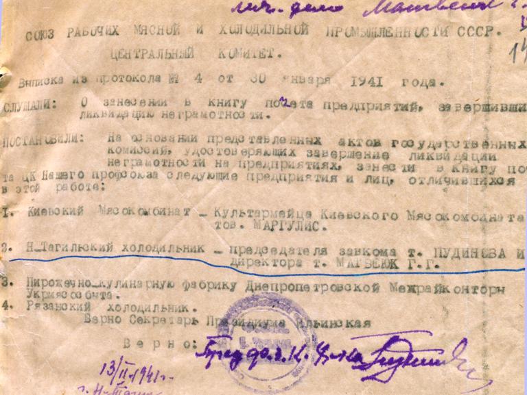 В предвоенный период страна продолжала бороться с неграмотностью населения. Широкое распространение получили школы ликбеза, которые организовывались непосредственно на предприятиях, где легче было выявить малограмотных, создав им условия для занятий, снабдив всем необходимым. За успехи в ликвидации неграмотности среди работников Нижнетагильского холодильника, имя Матвеюка занесено в Книгу почета Центрального комитета союза рабочих мясной и холодильной промышленности СССР.