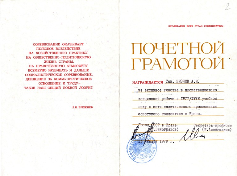 Учитывая колоссальный опыт работы руководителя гигантского строительного треста, Бизяев А.И. в 1976 был направлен в Иран, в город Исфахан главным консультантом по строительству металлургического завода. После возвращения из Ирана руководил отделом использования достижений науки и техники, изобретательства и рационализации Главстройнауки Госстроя СССР (г. Москва).