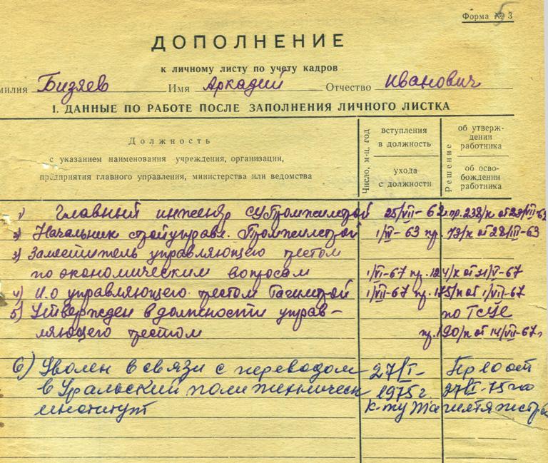 Муниципальный архив социально-правовых документов хранит более 289 тысяч единиц хранения – это документы, образовавшиеся в процессе деятельности ликвидированных предприятий нашего города. Одним из самых многочисленных фондов является фонд Открытого акционерного общества «Тагилстрой». И сегодня, мы хотим рассказать о человеке-легенде, родоначальнике династии строителей, прославившей профессию не только в стране, но и за ее пределами, о Бизяеве Аркадии Ивановиче - управляющем строительным трестом с 1967 по 1975.