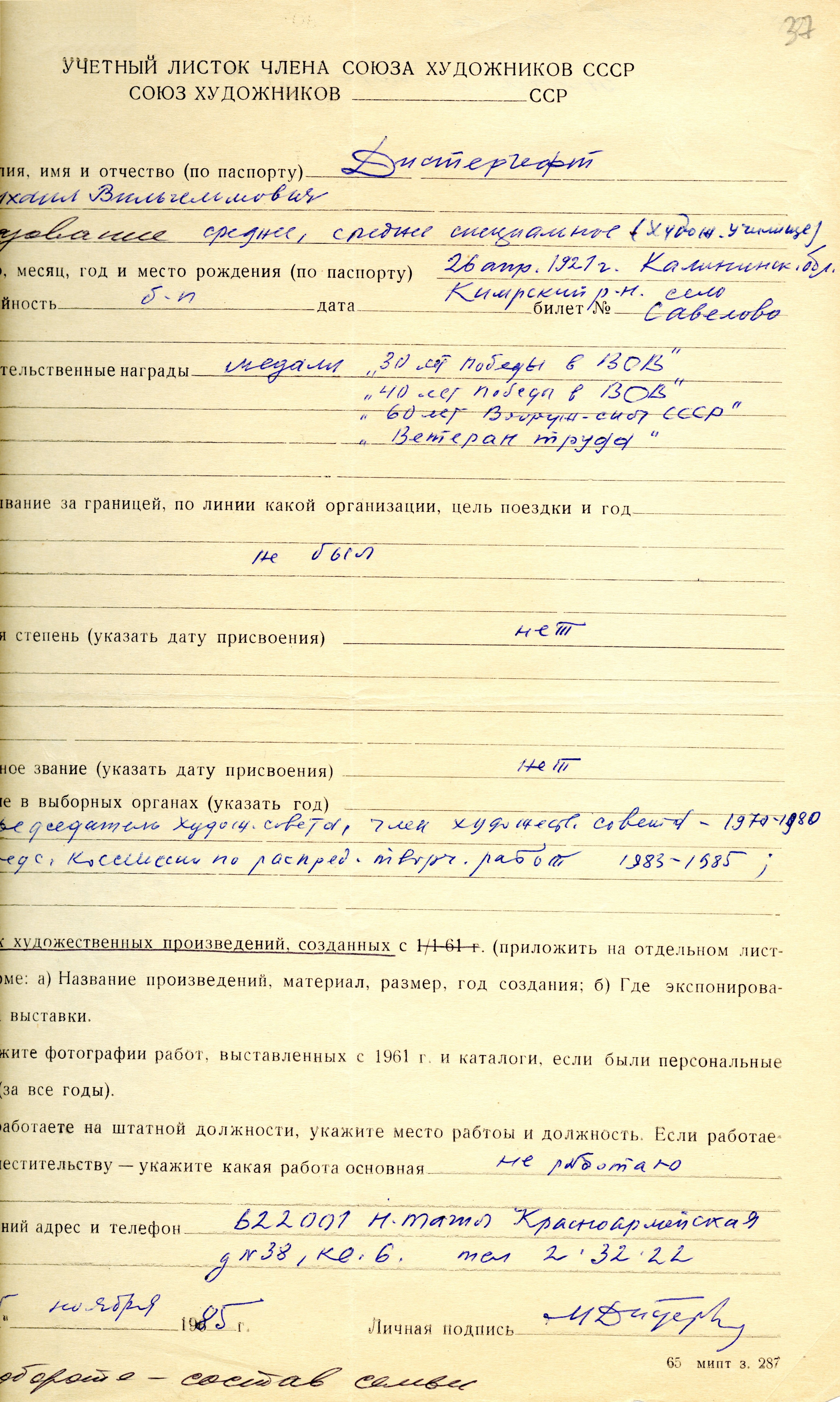Из личного дела Дистергефта Михаила Вильгельмовича (Васильевича) [2]