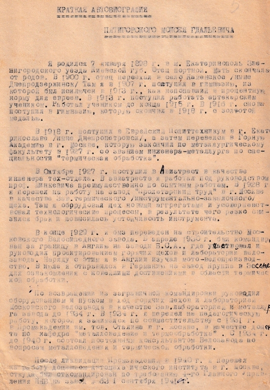 Среди огромного количества архивных документов бывших работников Высокогорского механического завода, сотрудниками Муниципального архива было выявлено личное дело главного металлурга предприятия - Пятигорского Моисея Гдальевича.