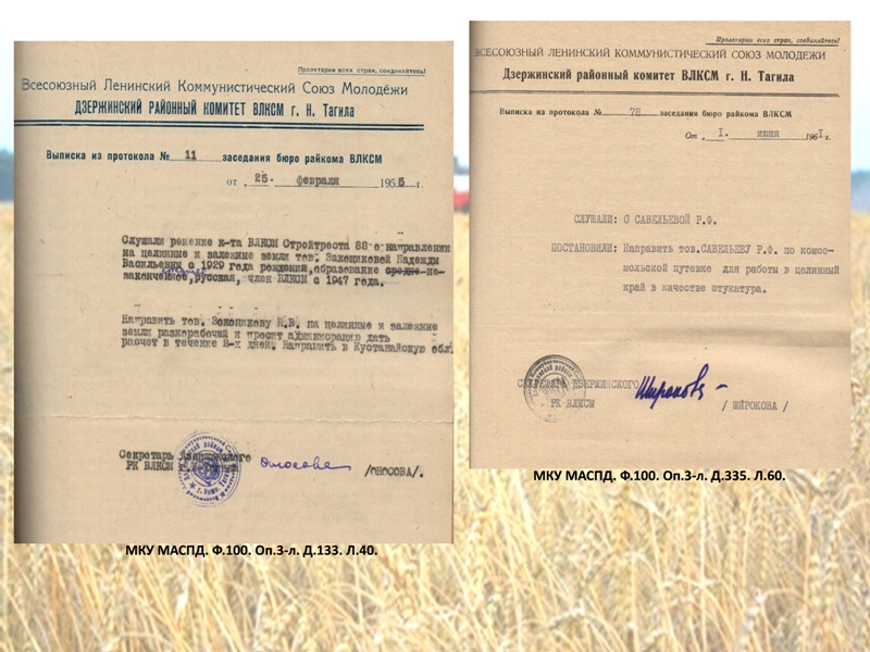 В горкомы и райкомы ВЛКСМ городов свои заявления несла молодежь. Большинство специалистов ехали не по принуждению, а потому что они были вчерашними фронтовиками и воспринимали призыв партии как свой долг. Молодежь желала испытать себя в чрезвычайных условиях, принести пользу стране. Целина стала комсомольско-молодежной стройкой. Уже к 23 марта 1954 года 20 тысяч комсомольцев Свердловской области изъявили желание поехать на новые земли. Не «остались в стороне» и тагильчане. В течение месяца Нижнетагильский городской комитет комсомола принял более 3000 заявлений. Получив комсомольскую путевку, «целинники» отправлялись на просторы степей Южного Урала, Казахстана, Алтая.