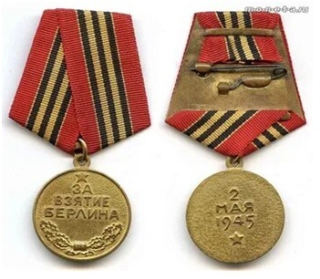 Медаль «За взятие Берлина» представляла собой круглую латуннуюмедаль диаметром 32 мм с выпуклым ободком на аверсе. На аверсе в верхней части была изображена пятиконечная звезда, верхняя точка которой касалась верхнего ободка медали. Под звездой - рельефная надпись жирными буквами в три ряда «ЗА ВЗЯТИЕ БЕРЛИНА», которая заканчивалась на середине медали. В нижней части рельефное изображение венка из дубовых ветвей, идущего по левой и правой сторонам медали до нижнего ряда надписи. На реверсе в верхней части - рельефная дата в три ряда над рельефной пятиконечной звездой «2 МАЯ 1945».