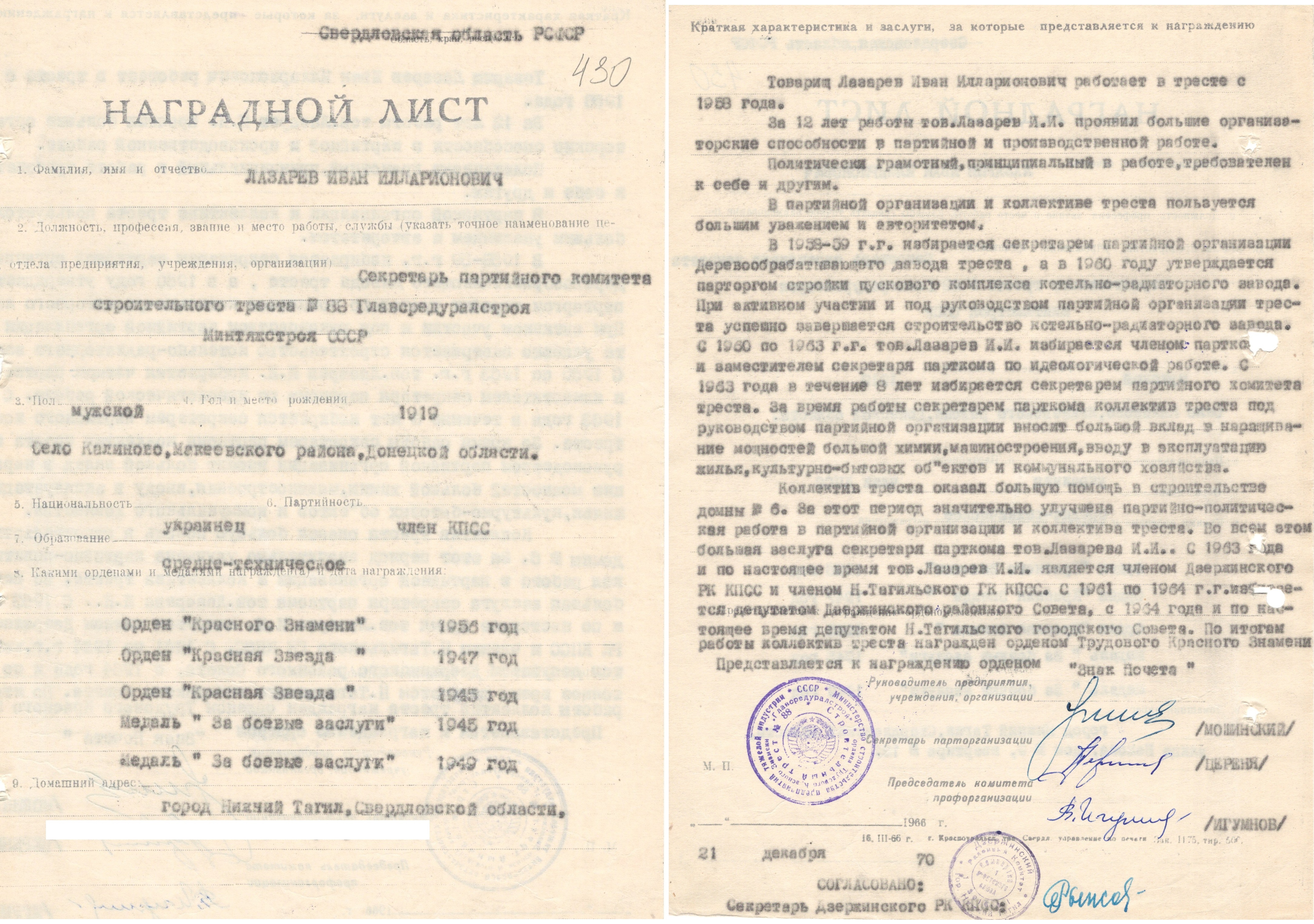 Из личного дела мастера участка малой механизации Строительного треста №88 Лазарева Ивана Илларионовича: «Товарищ Лазарев Иван Илларионович работает в тресте с 1958 года. За 12 лет работы тов. Лазарев И.И. проявил большие организаторские способности в партийной и производственной работе… При активном участии и под руководством партийной организации успешно завершается строительство котельно-радиаторного завода… Коллектив треста оказал большую помощь в строительстве домны №6… Во всем этом большая заслуга секретаря парткома тов. Лазарева И.И. Представляется к награждению Орденом «Знак Почёта».»